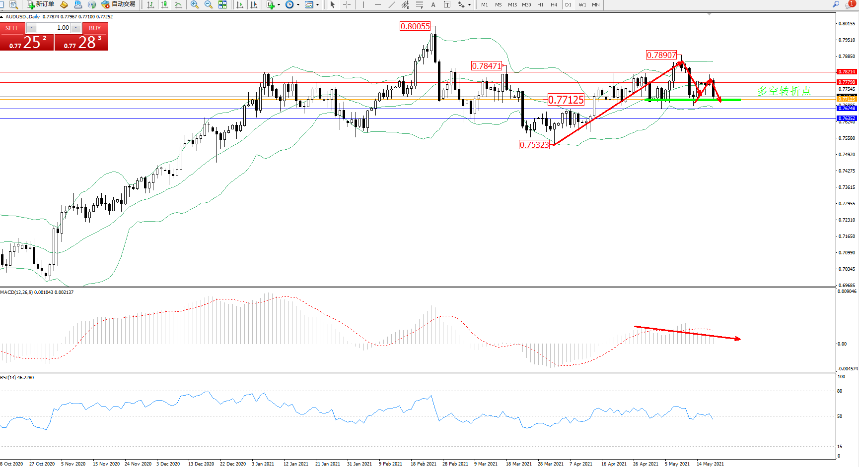 交易策略:0.77125上方看涨,目标0.77798、0.78214