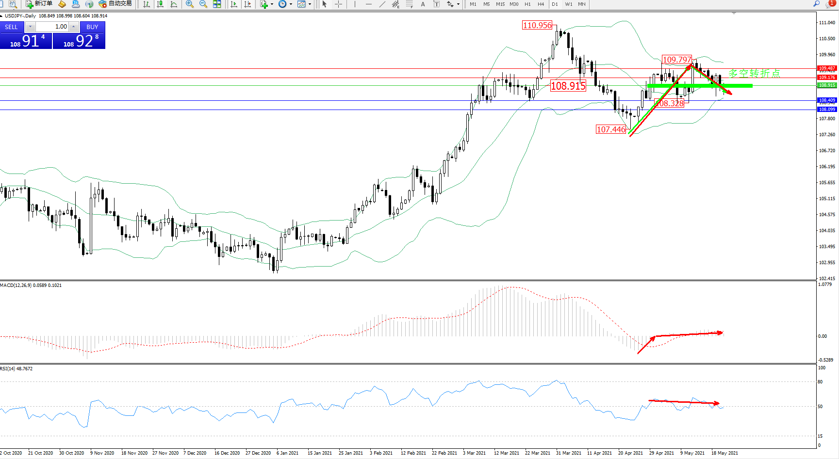 技术点评:低位多头动力持续震荡上扬,高位抵达布林带指标上轨附近109.797节点后遇阻回撤,维持在中轨附近继续窄幅震荡中,短期或有继续弱势平缓下移迹象,布林带指标呈缓慢收口走势平移后有继续徘徊迹象,MACD指标处于0轴线附近弱势徘徊中,RSI指标处于50均衡线附近维持窄幅震荡;