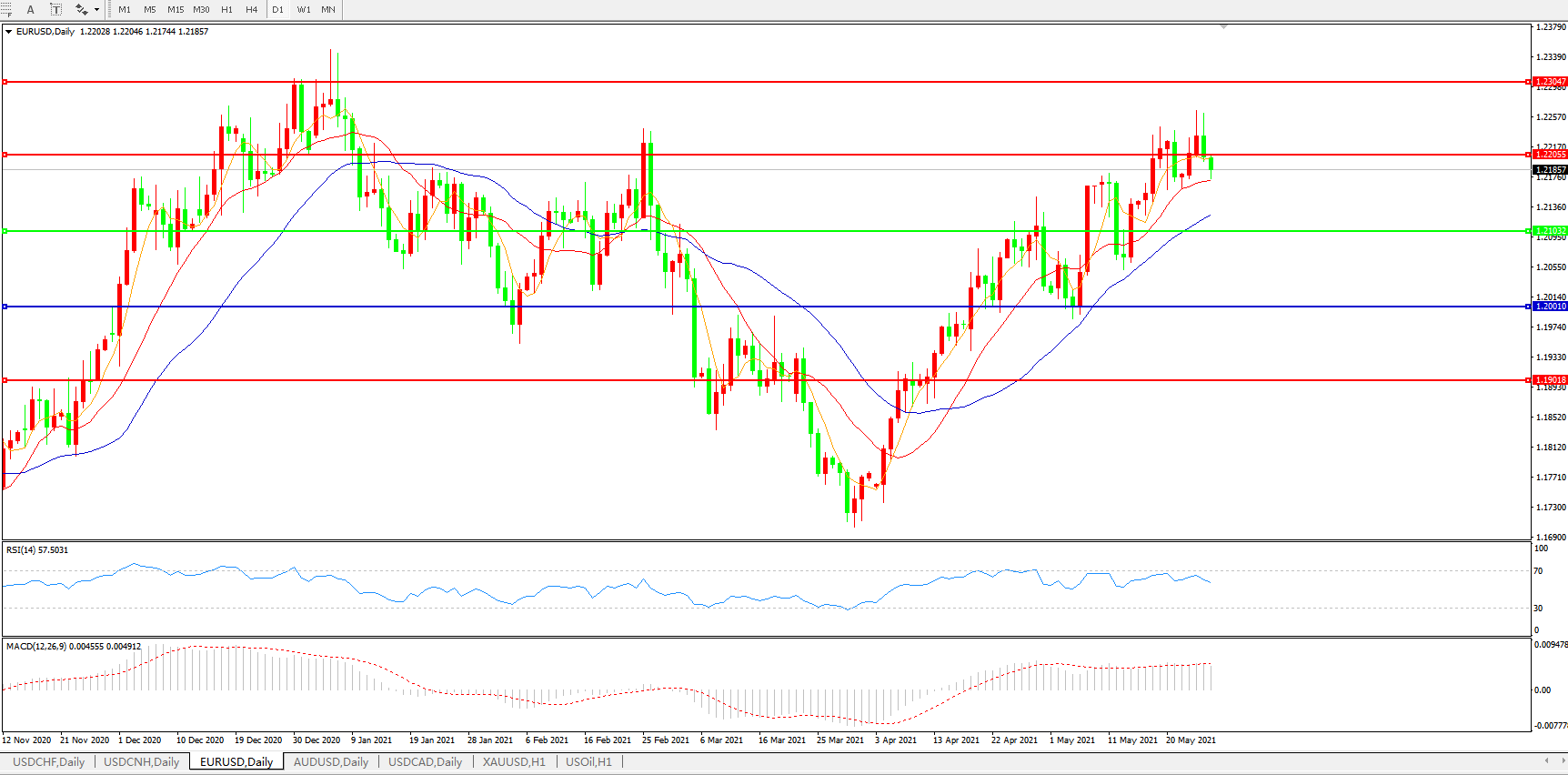 技术面简析:日图均线有些许弱势迹象,汇价开始回落,MACD运行于0轴上但量能开始微缩量,RSI缓步走弱,预计短期汇价大概率将进一步回踩整理。