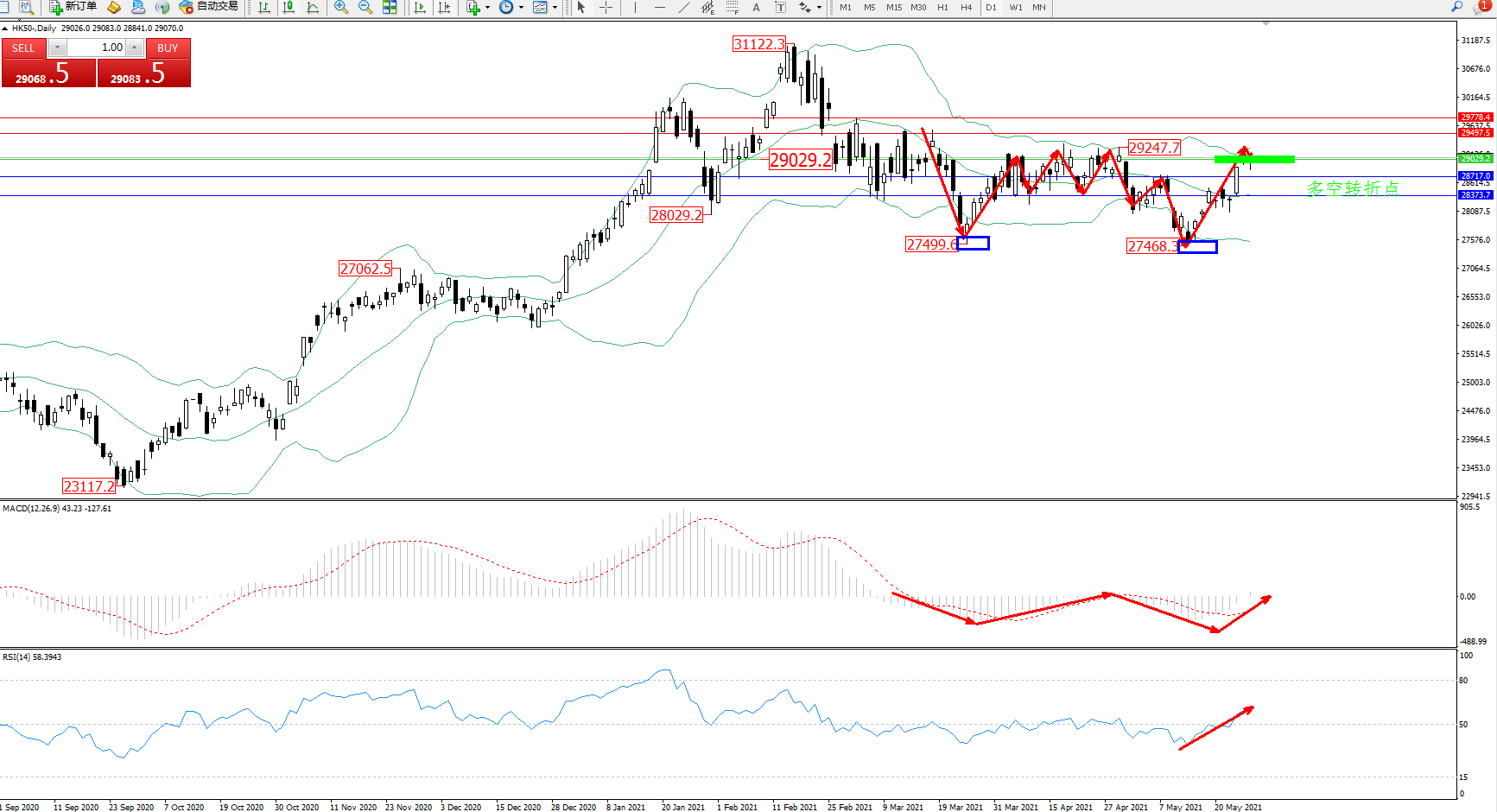 香港恒生指数5月27日(周四)收盘下跌52.81点,跌幅0.18%,报29113.2点;港股三大指数收盘涨跌不一,科技股多数上扬,恒生科技指数涨0.64%报8123点,半导体板块崛起,晶门半导体大涨超17%,华虹半导体升8%,中芯国际涨5.5%;大型科技股小米大涨逾3%,阿里巴巴、网易均上涨,美团跌近3%;区块链股走低明显。MSCI5月指数季度调整结果将于今日收盘后生效,多只中大盘股尾盘集合竞价放量明显。今日大市成交额放量至2505亿港元,南下资金净流入15.27亿港元。港卫生署卫生防护中心公布,截至5月27日零时零分,香港没有新增新冠肺炎确诊个案,为去年10月中以来首次。至今香港个案累计仍为11837宗。今日香港特区立法会三读表决通过了香港特区政府提交的《2021年完善选举制度(综合修订)条例草案》。在投票表决中,有40名立法会议员投赞成票。三读通过后,相关条例法案将经过行政长官签署,以及刊宪等程序后正式生效。