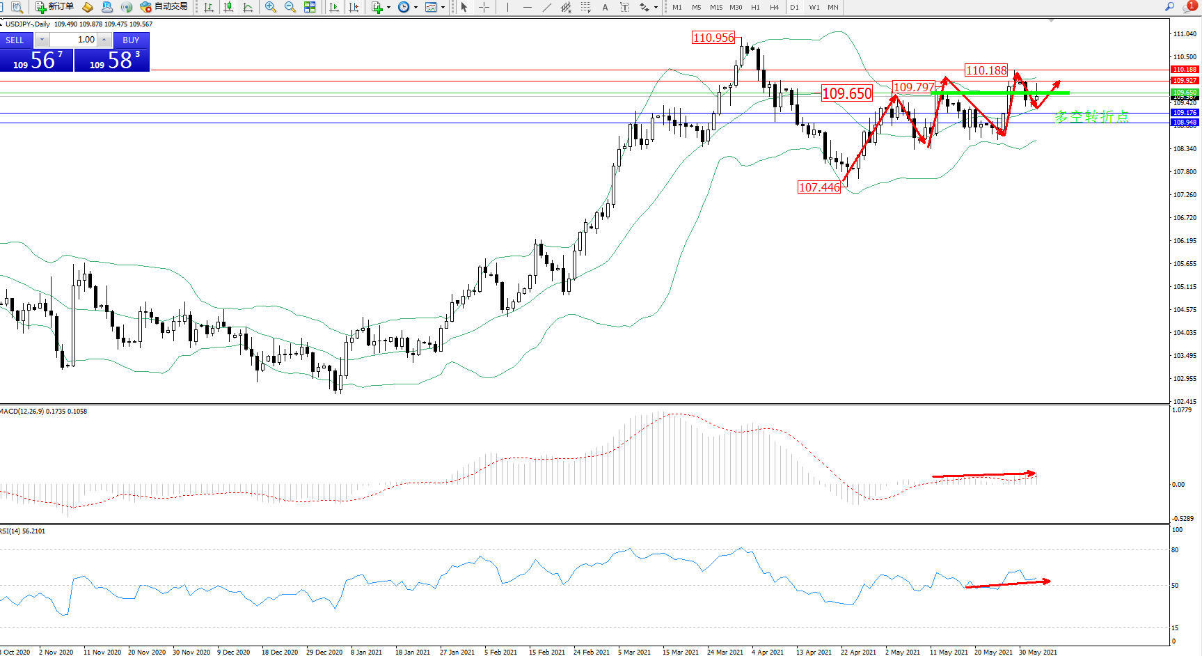 技术点评:高位维持在布林带指标通道内持续震荡,高位抵达110.188位置后遇阻回撤,处于中上轨区间震荡,波幅空间逐渐收窄中,布林带指标呈收口走势后开始整理,多头动力强势拉升突破上轨后短期受压回撤,但上行去态势依旧存在,关注上轨附近节点,MACD指标处于0轴线上方弱势整理中,RSI指标处于50均衡线上方持续震荡回撤中;