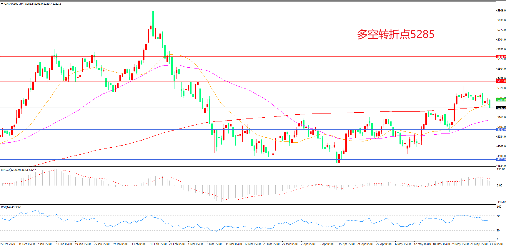 4小时图看,沪深300延续高位震荡后再度下行,前期涨幅被吞没,5285成为多空分水岭,200周期均线成为下方支撑,MACD红柱缩短,RSI指标走平,日内震荡上行概率较大。