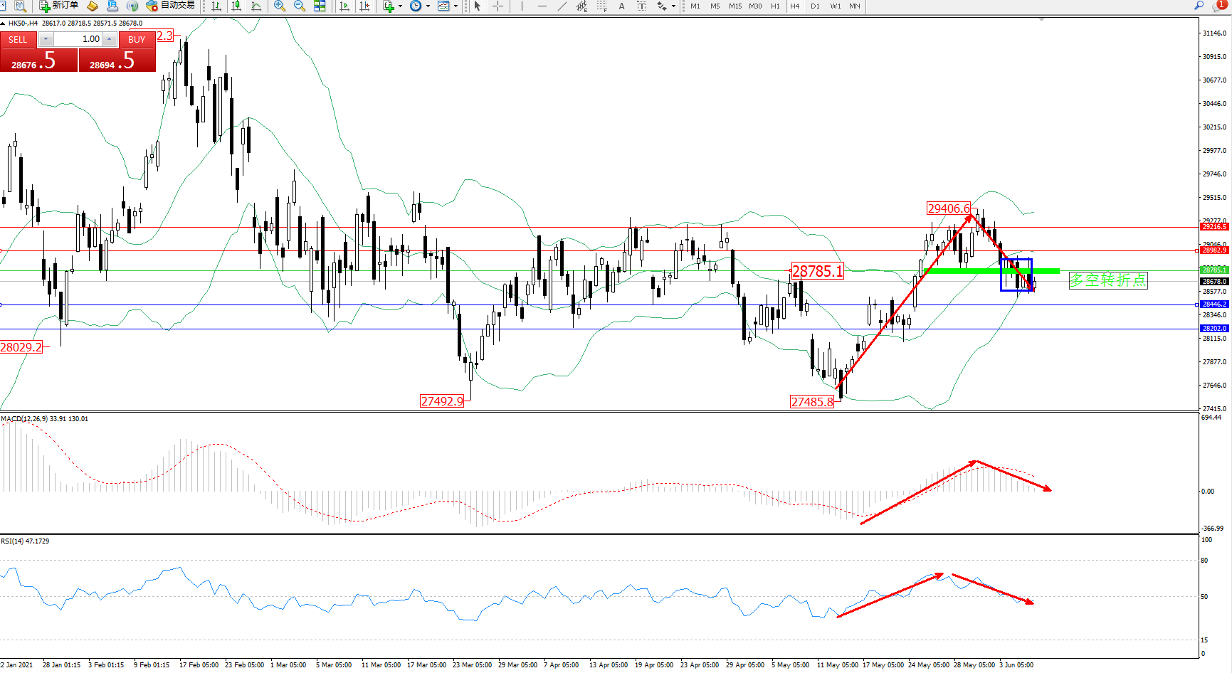 技术点评:低位多头动力持续震荡上扬至布林带指标上轨29406附近遇阻整理,短期徘徊后空头动力伺机入场反转下行,触及布林带指标下轨附近节点后得到短暂支撑开始震荡,布林带指标呈收口走势后有张口迹象,关注中下轨区间节点,短期空头或有进一步调整下行迹象,MACD指标处于0轴线上方多头区域维持整理向下移动,RSI指标处于多头区域维持窄幅震荡后跌破50均衡线进入空头动力弱势徘徊;