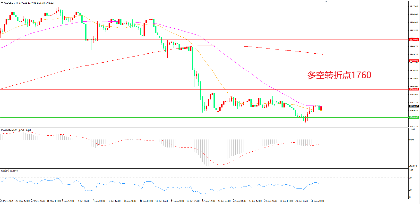 周四(7月1日),美国就业数据表现亮眼,初请失业金人数创疫情爆发以来新低,美元受到提振大幅走高,金价表现坚韧,收报1776.43美元/盎司。美联储官员暗示减少资产购买计划后,市场所有的焦点都在今晚的非农就业数据上,如果晚间非农数据表现强劲,劳动市场走强的迹象可能会增添美联储加快加息步伐的压力,并提振美元,而如果数据不及预期,美元将变得脆弱,黄金将迎来反弹良机。