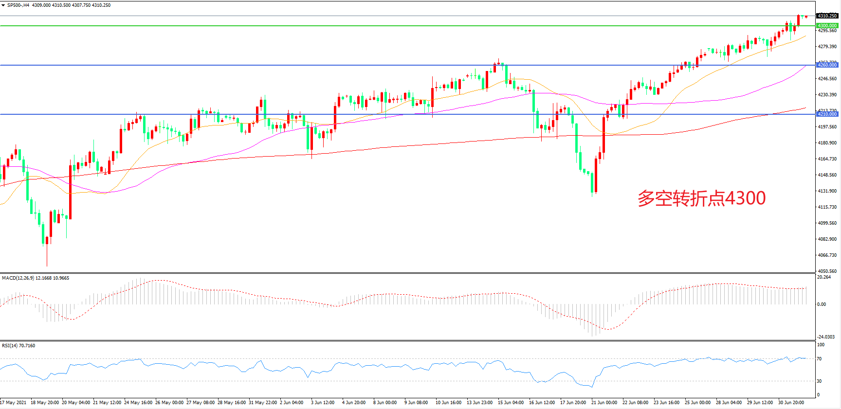 周四(7月1日),美国初请失业金人数远低于预期,创疫情爆发以来新低,6月ISM制造业指数保持稳步扩张,靓丽的数据推动美股大幅走高,收报4309点。在美联储官员暗示美联储今年应减少资产购买计划后,市场目前的焦点是周五的非农就业报告,以寻找有关美国货币政策转变时间表的线索,如果晚间非农数据与此前数据表现一致,标普可能迎来新一轮大涨。