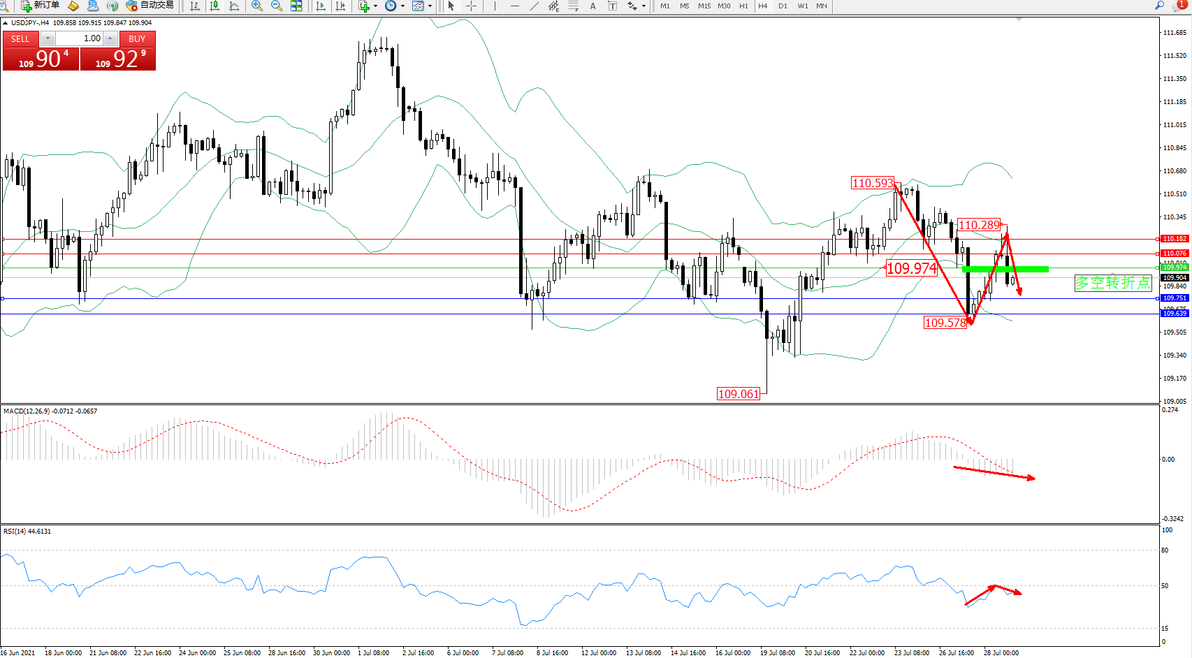 技术点评:高位空头动力持续震荡下行至109.578位置后开始震荡上移,突破布林带指标中轨至110.289位置后遇阻再度下行,空头动力有进一步向下移动迹象,布林带指标呈收口走势持续下行,MACD指标处于0轴线下方空头区域维持整理平移,RSI指标处于50均衡线下侧弱势整理中;