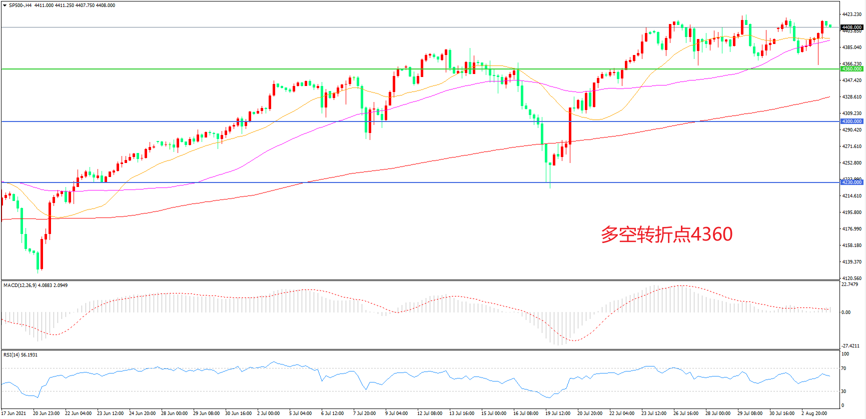 周二(8月3日),虽然美国数据表现喜忧参半,但部分大企业的财报业绩向好提振了市场信心,标普500先跌后涨,收报4410点。大型科技股中,仅跌Facebook和奈飞收跌,苹果涨超1%,亚马逊约1%。本周,市场静待备受关注的美国 7 月非农就业报告的出炉,在此之前,有“小非农”之称的ADP就业数据将在晚间20:15公布,务必重点关注。