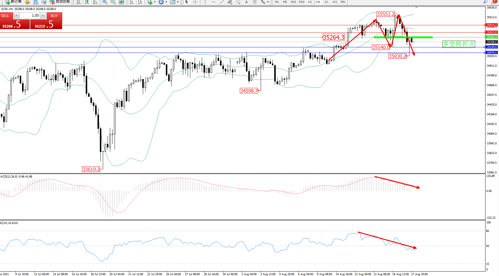 技术点评:多头动力延续布林带指标通道中上轨持续震荡上扬,高位抵达35553位置遇阻回撤,抵达35030位置后短暂支撑,高位空头动力强势入场下挫,短期或维持弱势回升下行,布林带指标呈收口走势后开始缓慢张口,MACD指标处于多头区域震荡持续回撤至0轴线附近徘徊,RSI指标持续震荡回撤至50均衡线下方徘徊;
