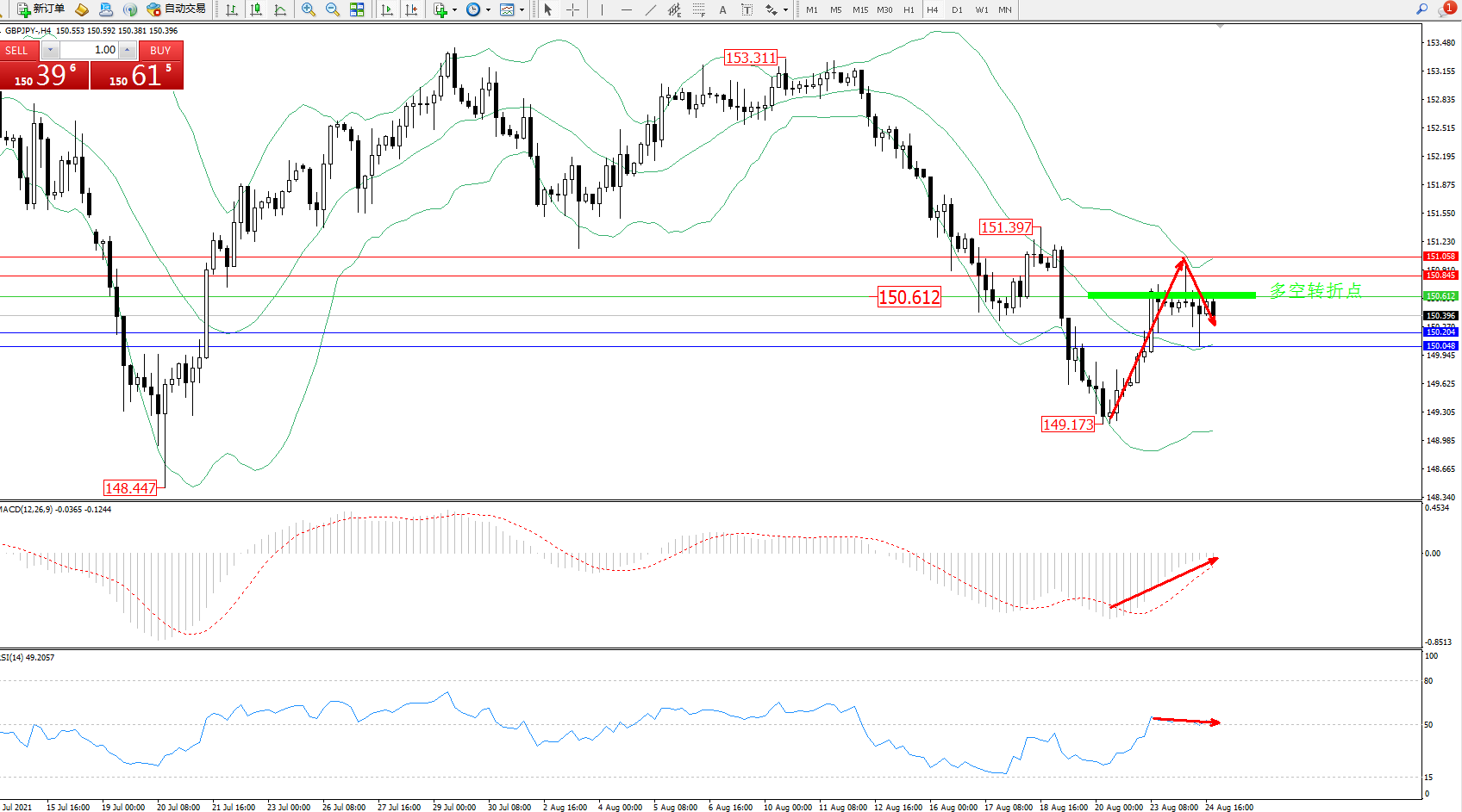 备选策略:150.612上方看涨,目标150.845、151.058