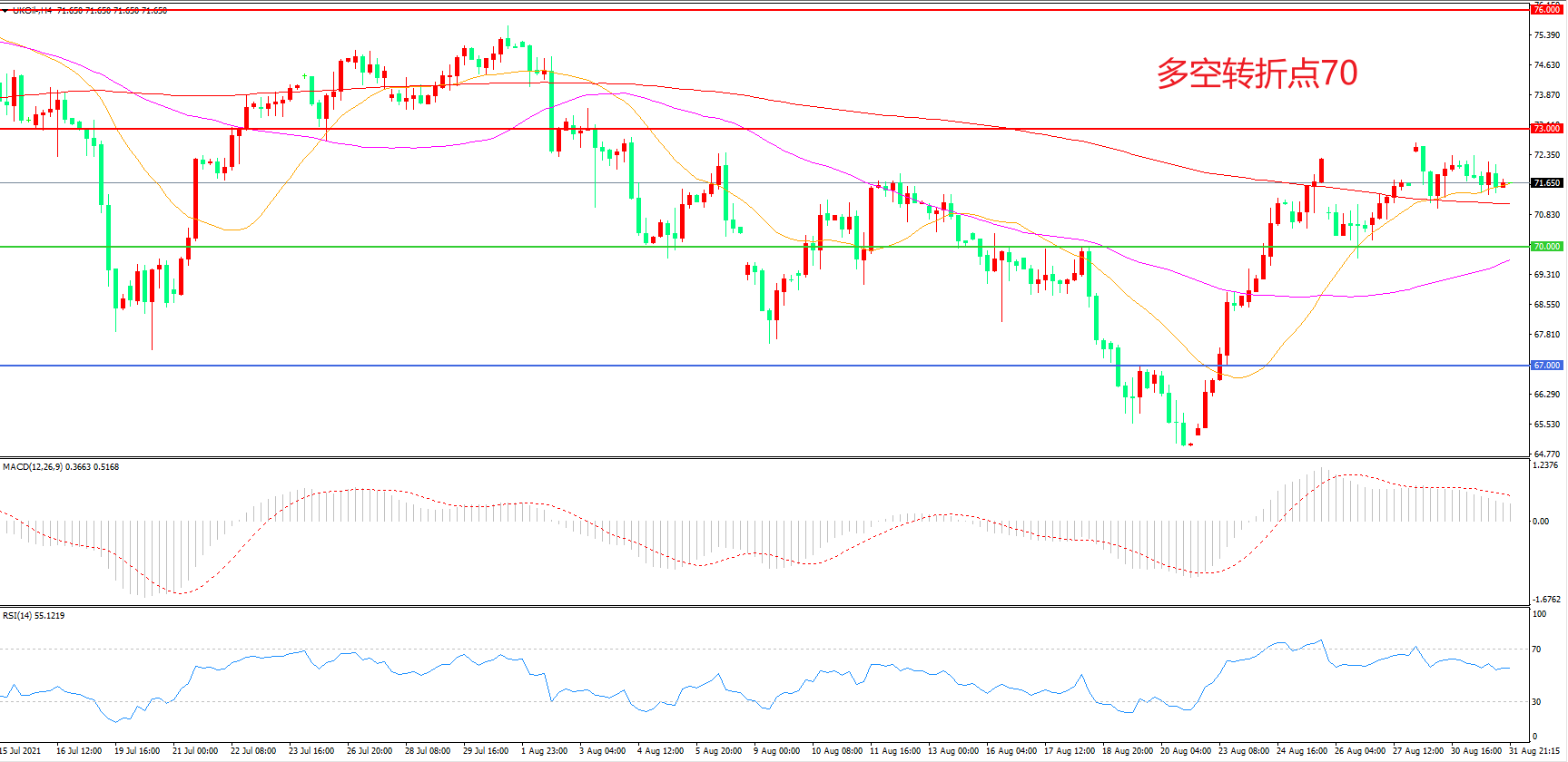 4小时图看,油价突破70美元后延续窄幅震荡,整体表现偏强, 200周期均线被顺利突破,MACD红柱缩短,RSI指标走平,日内震荡上行概率较大。