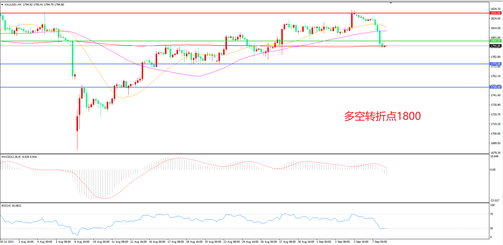 周二(9月7日),因美国劳动节假期过后美元走强,黄金遭到抛售,22:02一分钟内,COMEX黄金瞬间成交5273手,交易合约总价值9.52亿美元。现货黄金失守1800美元整数关口,收报1795.32美元/盎司。如今,投资者的焦点已经转移到周四的欧洲央行会议上,随着欧元区经济复苏,欧洲央行可能会讨论如何收回刺激措施,可能会对美元指数的短期走势产生一定的冲击。