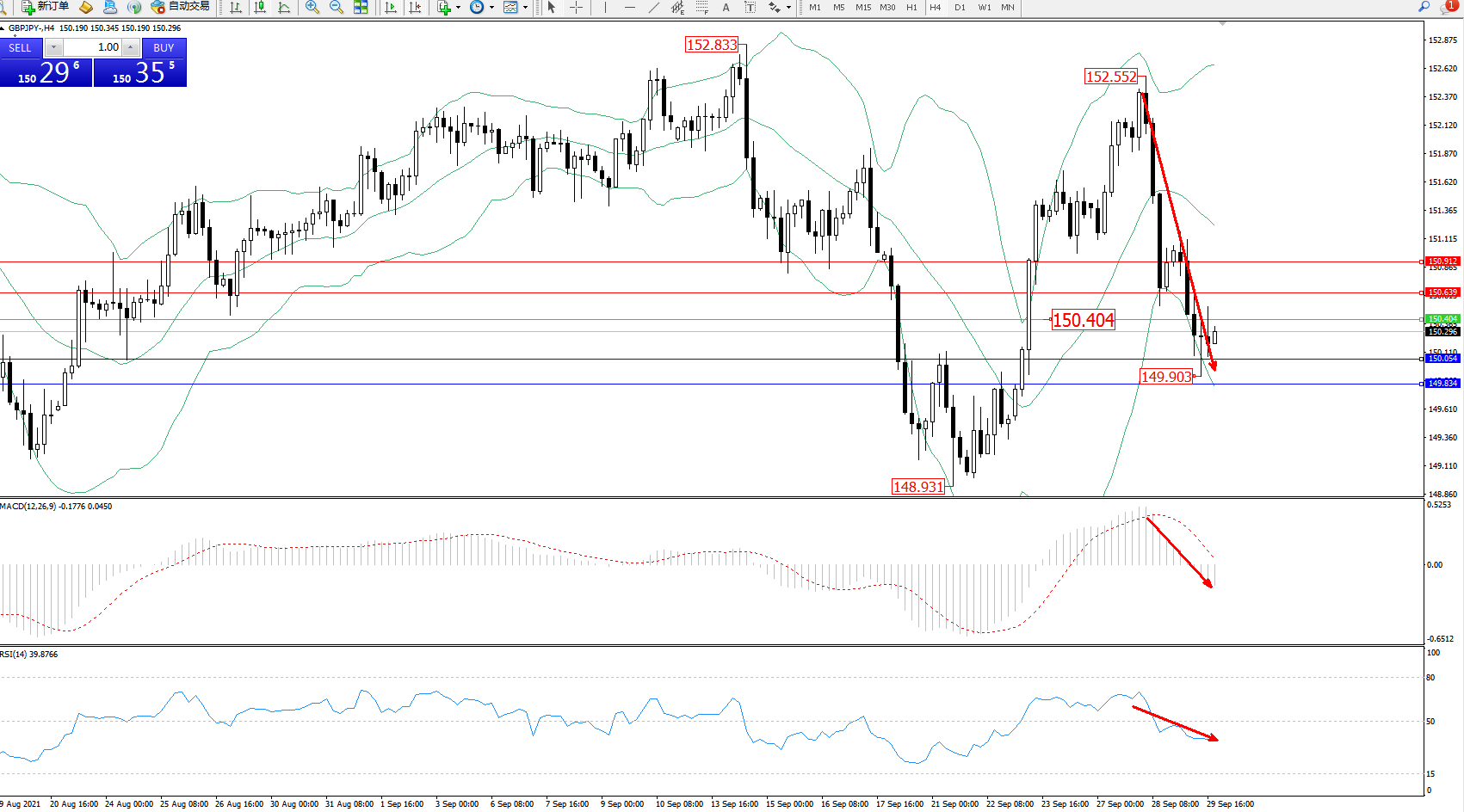 技术点评:高位空头动力延续布林带指标下轨附近持续震荡下探,低位抵达149.903位置后开始短暂震荡,空头动力依旧有进一步向下移动态势,布林带指标呈缓慢张口走势持续中,MACD指标处于0轴线下方空头区域维持整理不断下移,RSI指标处于50均衡线下方维持弱势整理中;