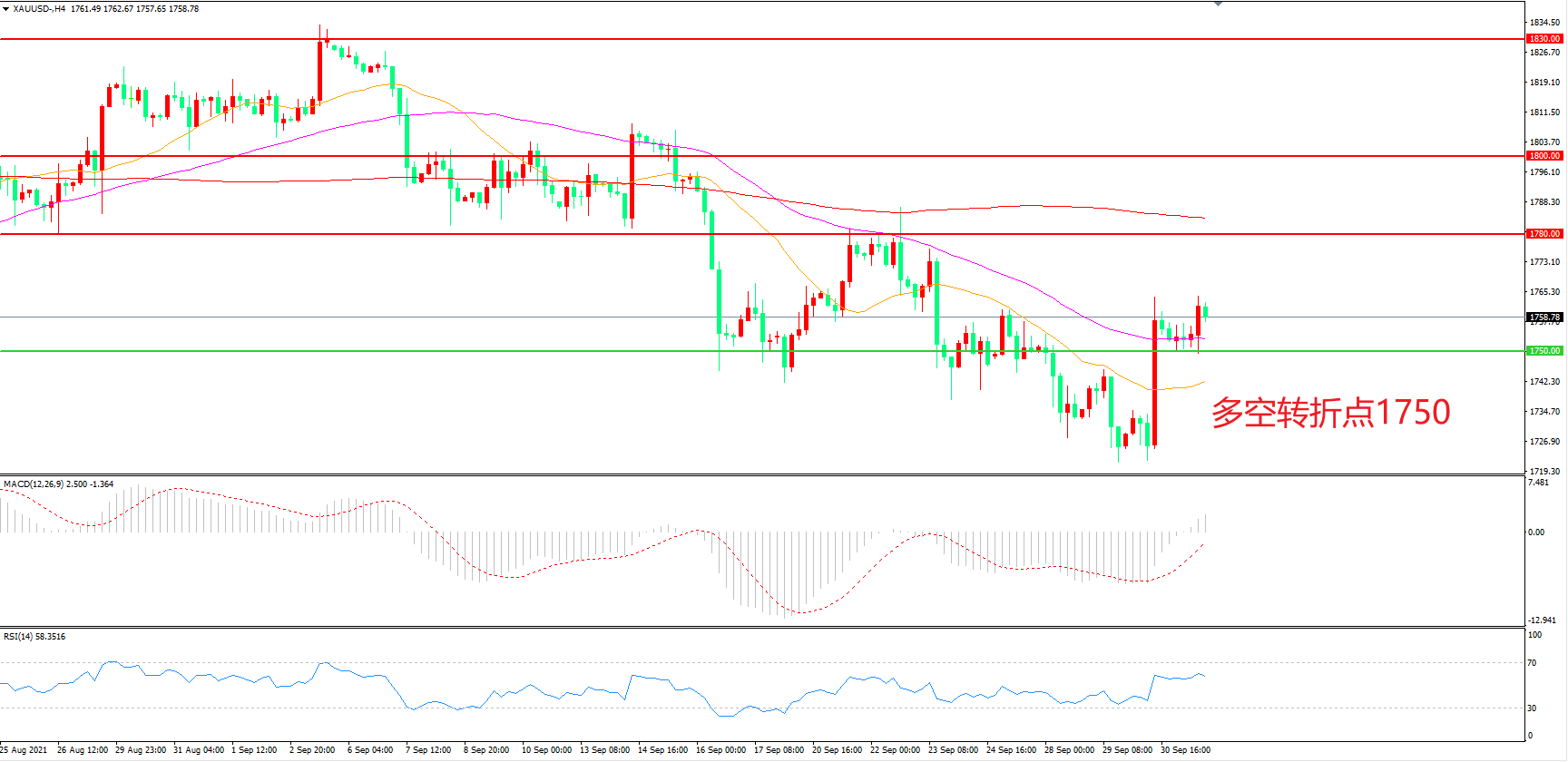 上周,市场再度迎来过山车一样的行情,美联储主席鲍威尔对通胀态度的有所改变引发了对通胀前景的担忧, 10年期美债收益率的连续攀升导致金价一度跌至1720美元附近,但随着美元在下半周缩减涨幅,金价大幅反弹,收报1758.75美元/盎司。本周9月非农就业报告即将来临,而在此之前出炉的ISM非制造业PMI与ADP就业人数等数据以及美联储官员的讲话将明显增加市场的波动性,金价有望再度迎来拉升。