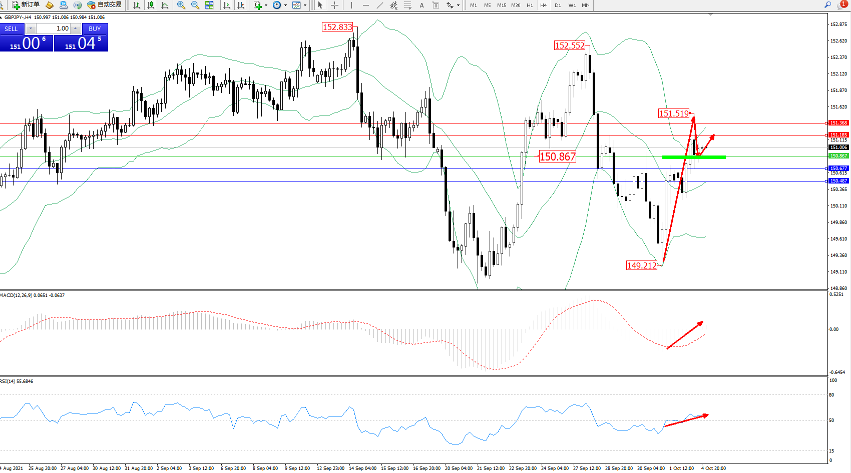 技术点评:低位多头动力强势拉升上扬,高位抵达151.519位置后遇阻回撤,短期多头动力开始整理,但多头上扬态势良好,有进一步向上移动态势,布林带指标呈张口走势持续中,MACD指标处于空头区域低位震荡持续上扬至0轴线上方徘徊,RSI指标处于50均衡线上方维持整理中;