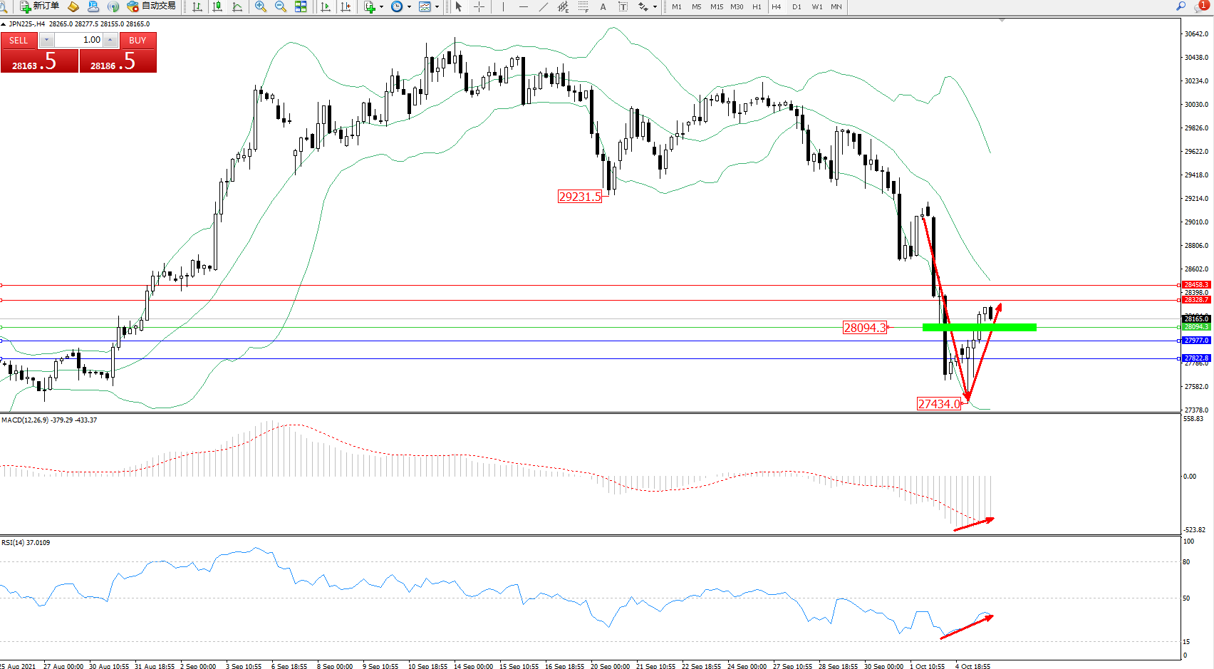 技术点评:空头动力急速震荡下挫后,低位抵达27434位置得到支撑强势反转上移,多头动力伺机入场,短期多头动力或有一定拉升,布林带指标呈向下移动去趋势走势后开始有收口平移迹象,MACD指标处于空头区域低位开始缓慢上移,RSI指标处于空头区域低位震荡缓慢向上移动;