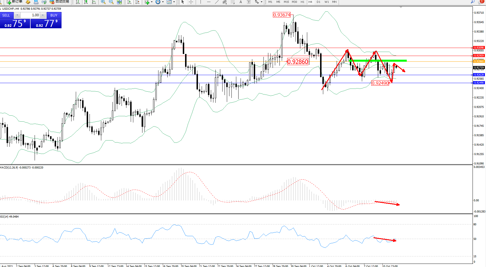 交易策略:0.92860下方看跌,目标0.92628、0.92490