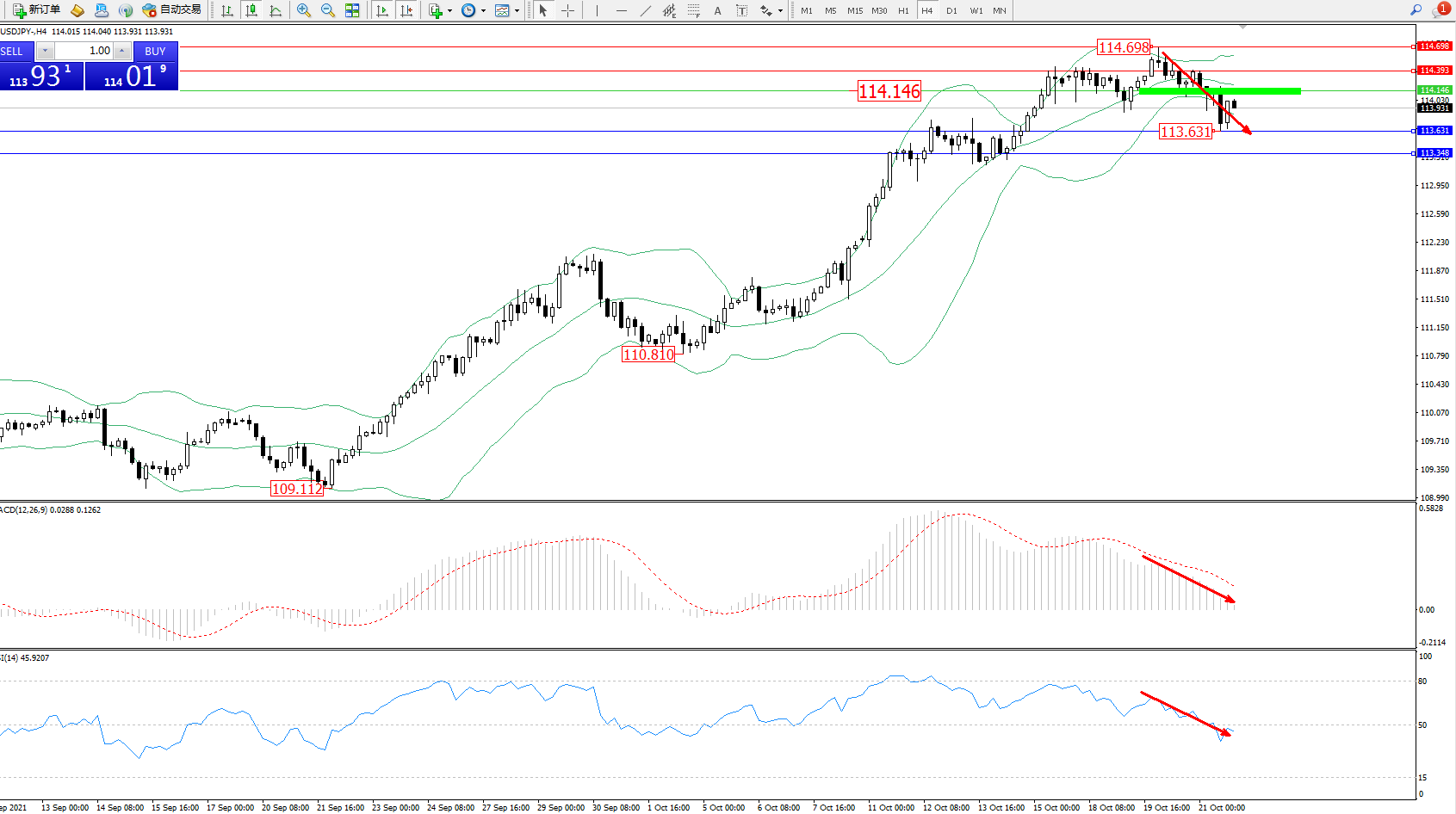 技术点评:多头动力延续布林带指标通道中上轨区间持续震荡上扬,高位抵达114.698位置节点后遇阻开始震荡回撤,低位抵达113.631位置后有继续向下移动态势,布林带指标呈缓慢张口走势持续中,MACD指标处于多头区域维持整理持续下行至0轴线附近徘徊,RSI指标空头动力持续下行至50均衡线附近整理中;