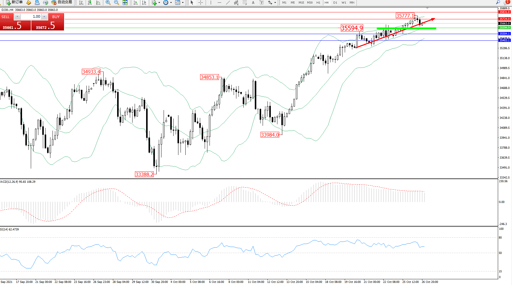 技术点评:多头动力延续布林带指标通道中上轨区间持续震荡上扬,高位抵达35777位置后出现短暂整理回撤走势,但多头上扬潜力依旧,有继续攀升态势,布林带指标呈多头上扬走势态势良好,MACD指标处于多头区域维持整理平移中,RSI指标处于多头区域维持弱势徘徊中;