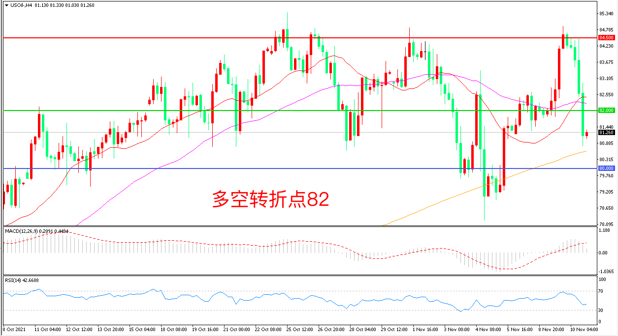 4小时图看,油价触碰84.5美元阻力后破位大跌,短期走势陷入低迷,200周期均线成为支撑,82成为多空分水岭,MACD红柱缩短,RSI指标走平,日内震荡上行概率较大。