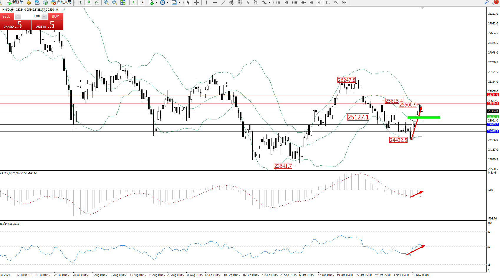 技术点评:多头动力低位强势拉升,突破布林带指标上轨至25500位置节点后开始短暂调整,多头动力仍有上扬潜力,布林带指标呈收口走势持续收窄中,MACD指标处于空头区域低位整理缓慢上移即将触及0轴线附近徘徊,RSI指标低位多头动力持续震荡上移至50均衡线上方徘徊中;