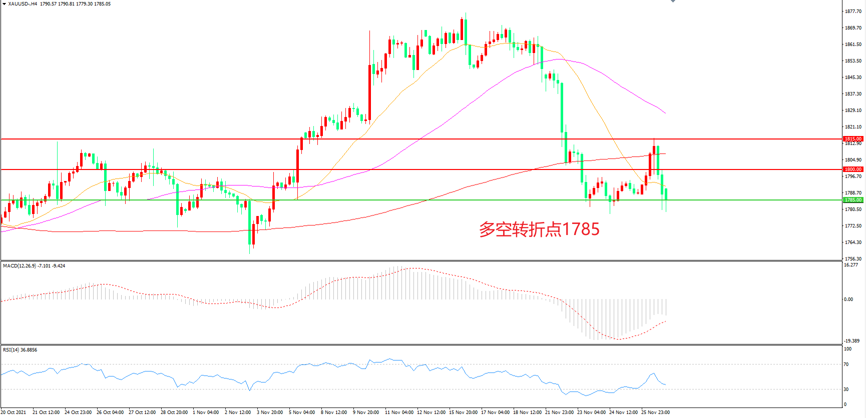 4小时图看,金价触碰1800关口后再度回落,短期走势偏空,1785成为短期多空分水岭,MACD绿柱缩短,RSI指标走平,日内震荡下行概率较大。
