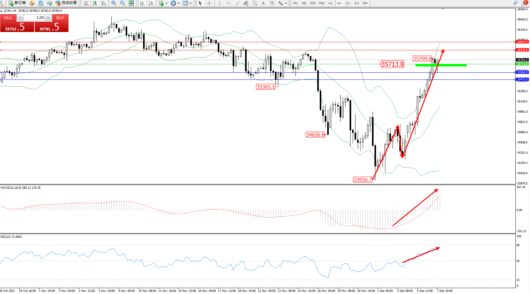 技术点评:多头动力延续布林带指标上轨附近持续震荡上扬,高位抵达35799位置后开始震荡,短期多头动力有继续向上拉升态势,布林带指标呈张口走势态势良好,MACD指标处于多头区域维持震荡上扬中,RSI指标处于多头区域维持整理持续上移后开始徘徊;
