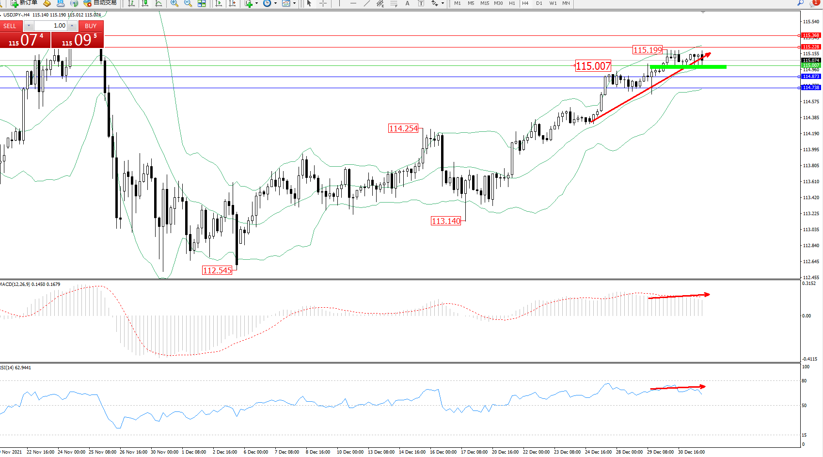 备选策略:115.007上方看涨,目标115.228、115.368