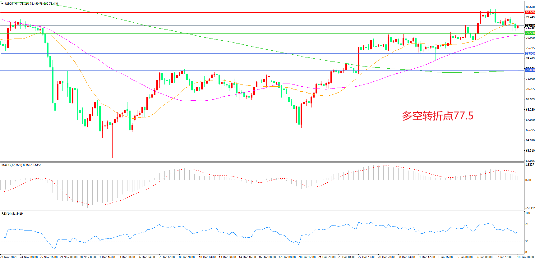 4小时图看,油价触碰80美元后小幅回落,区间震荡迹象明显,80美元成为上方阻力,77.5成为下方支撑,MACD红柱缩短,RSI指标走平,日内延续震荡概率较大。