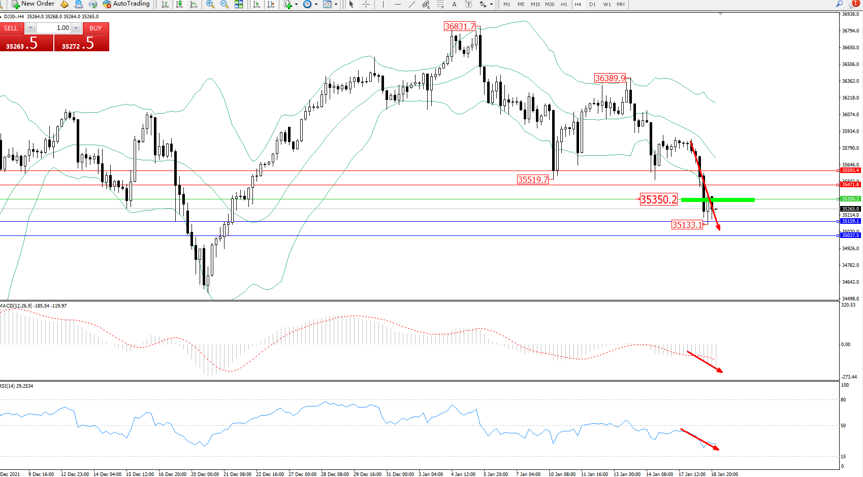 道琼斯指数1月18日(周二)收盘下跌542.80点,跌幅1.51%,报35369.01点;美股收盘,道指骤跌,货币市场价格显示,越来越多投资者预期美联储可能逾二十年来首次大规模提高借贷成本。虽然加息25个基点仍是最有可能的情形,但掉期市场现在预计3月底前加息幅度将超过25个基点。鉴于本月政策会议预计不会有任何行动,这表明交易员至少正在考虑3月加息50个基点的可能性。自2000年5月以来, 美联储还从没有一口气加息这么多过;近日来围绕美联储更大幅加息的猜测升温可能加剧了周二美国国债跌势。 摩根大通首席执行官杰米·戴蒙上周警告美联储收紧政策可能不会像一些人预期的那样“和风细雨”。