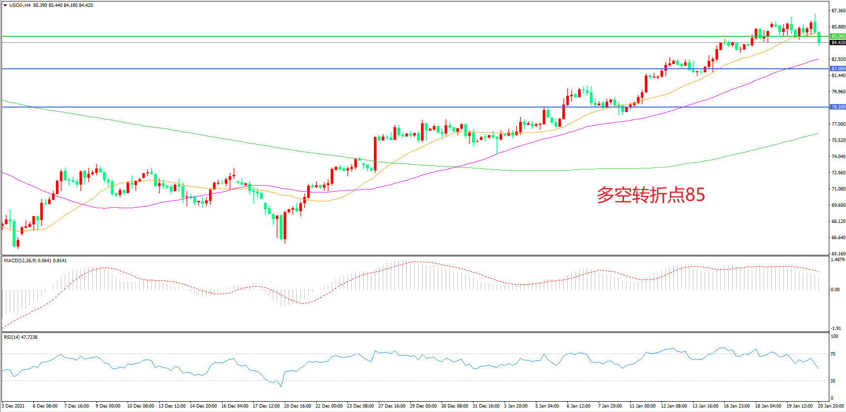4小时图看,油价连续上行后小幅回落,但上行趋势依然未受到破坏,55周期均线成为下方支撑,85美元成为多空分水岭,MACD红柱缩短,RSI指标走平,日内延续震荡概率较大。