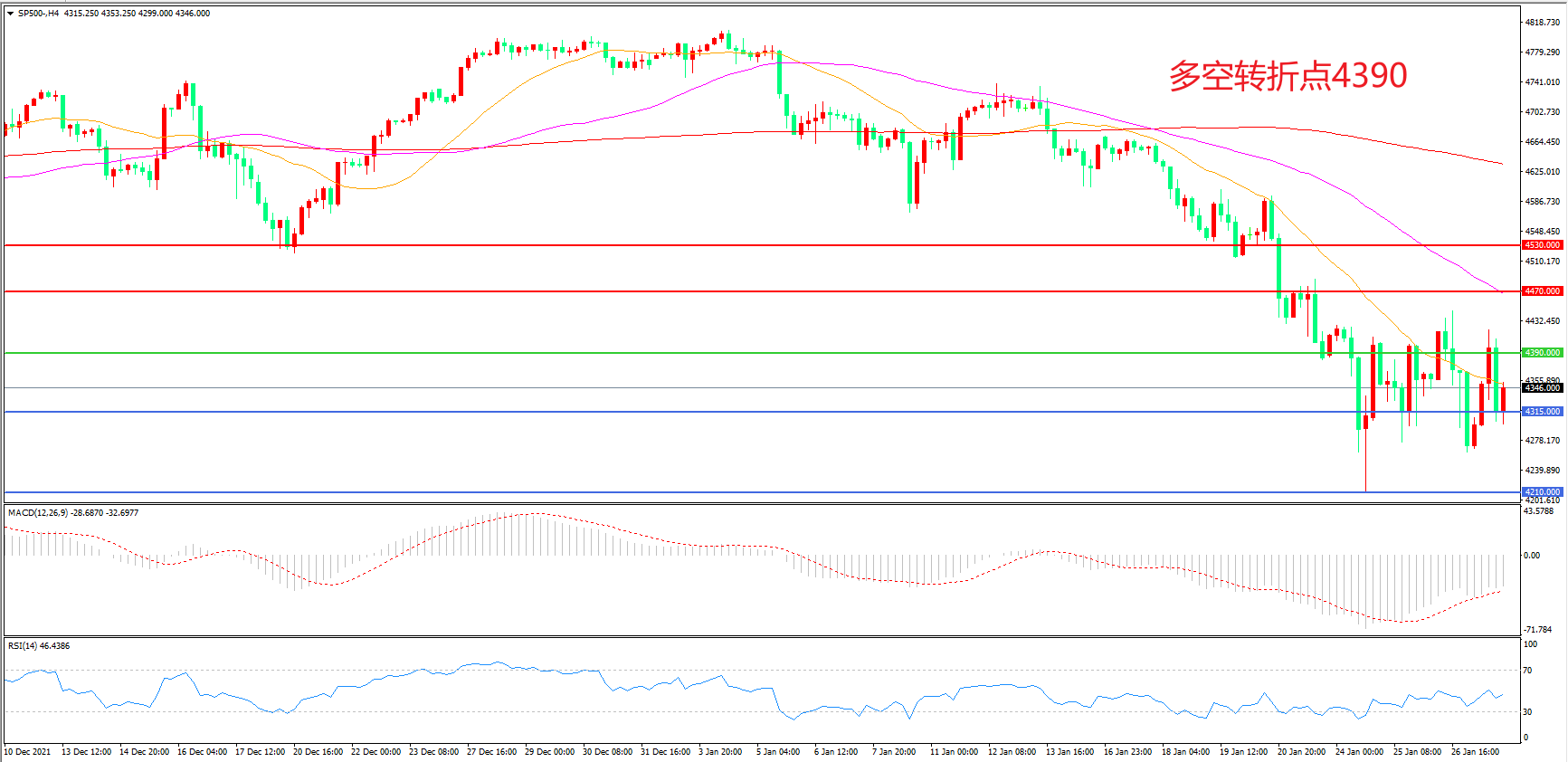 4小时图看,标普500延续低位宽幅震荡,整体表现偏空,均线系统呈空头排列,4390成为多空分水岭,MACD绿柱缩短,RSI指标走平,日内震荡下行概率较大。