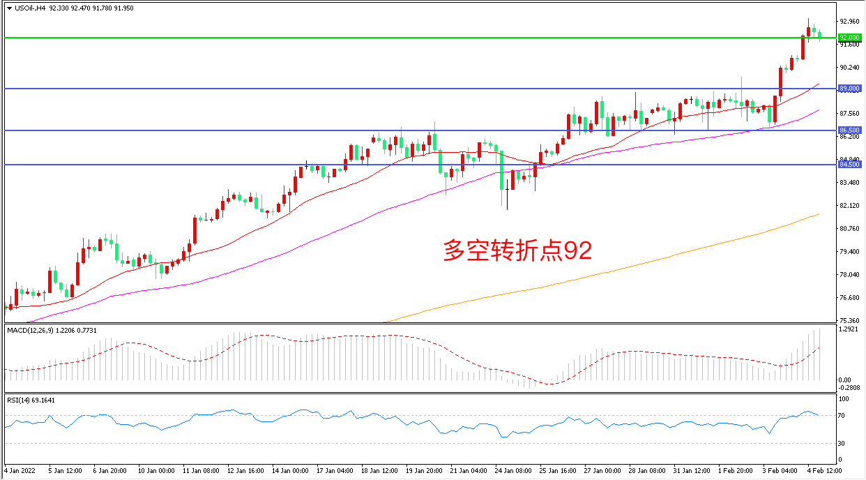 4小时图看,油价长阳连续拉升,短期走势偏强,89美元成为下方支撑,92美元成为多空分水岭,MACD红柱增加,RSI指标走平,日内震荡上行概率较大。