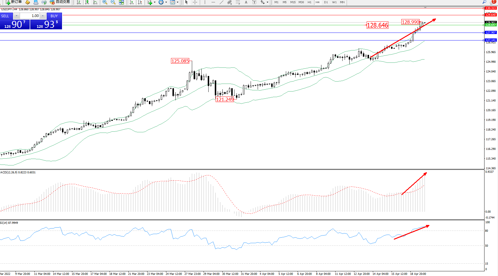 技术点评:多头动力延续布林带指标通道中上轨区间持续震荡上扬,高位抵达128.990附近节点后开始整理,短期多头动力有继续攀升态势,布林带指标呈上行趋势走势态势良好,且处于缓慢张口走势中,MACD指标处于多头区域维持震荡不断上扬中,RSI指标处于多头区域维持震荡上扬至超买区80均衡线上側上移中;