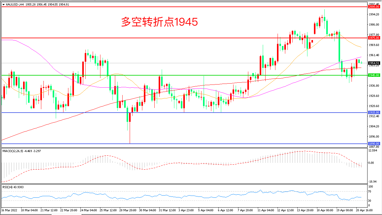 周三(4月20日),随着俄乌冲突战场上的变化,美国及其西方盟友不仅没有做出“降温”举动,反而加码“拱火”, 俄乌局势的恶化为金价提供支撑,现货黄金小幅反弹,收报1955.46美元/盎司。今日,美联储主席鲍威尔和欧洲央行行长拉加德将就全球经济发表讲话,欧美央行在货币政策上的分歧将决定美元中期走势,进而对金价形成巨大影响。