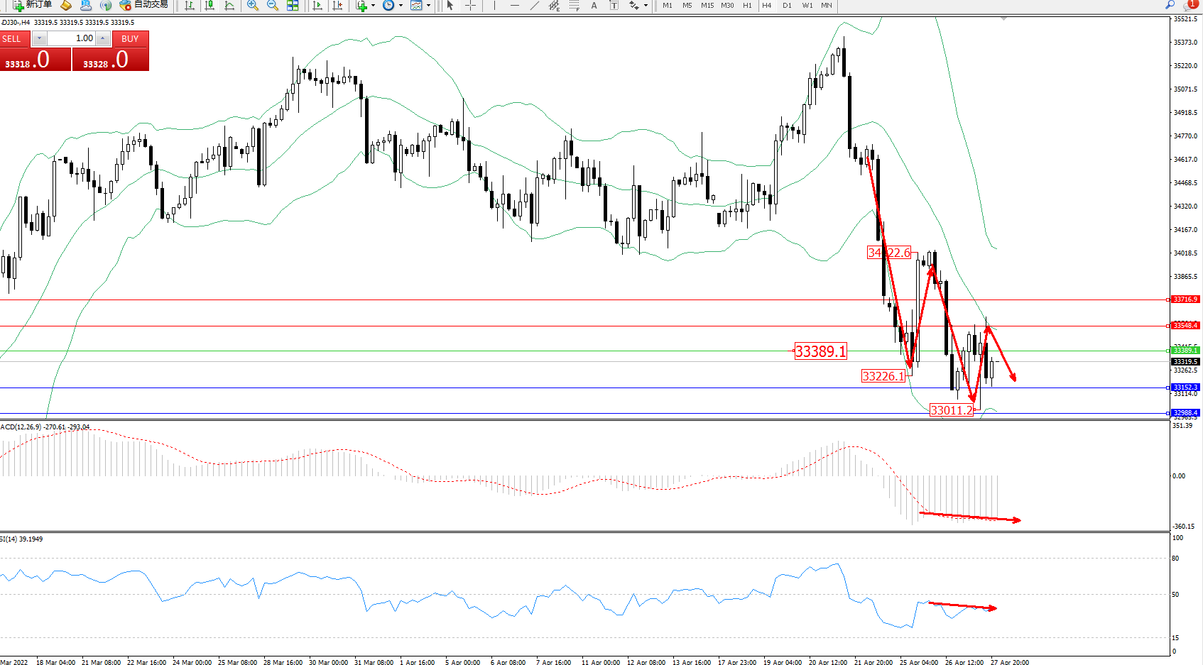 技术点评:空头动力延续布林带指标通道中下轨区间持续震荡向下移动,短期抵达33011附近节点后有继续向下移动态势,布林带指标呈收口走势不断下行后低位开始收口平移,MACD指标处于空头区域维持整理平移,RSI指标处于50均衡线下侧弱势徘徊中;