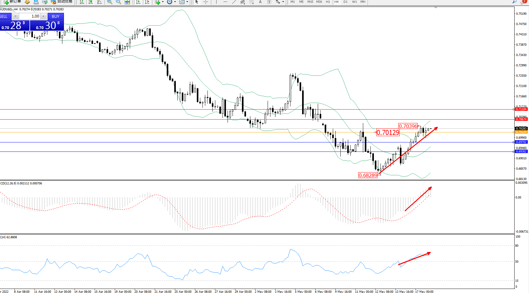 交易策略:0.70129上方看涨,目标0.70674、0.71104