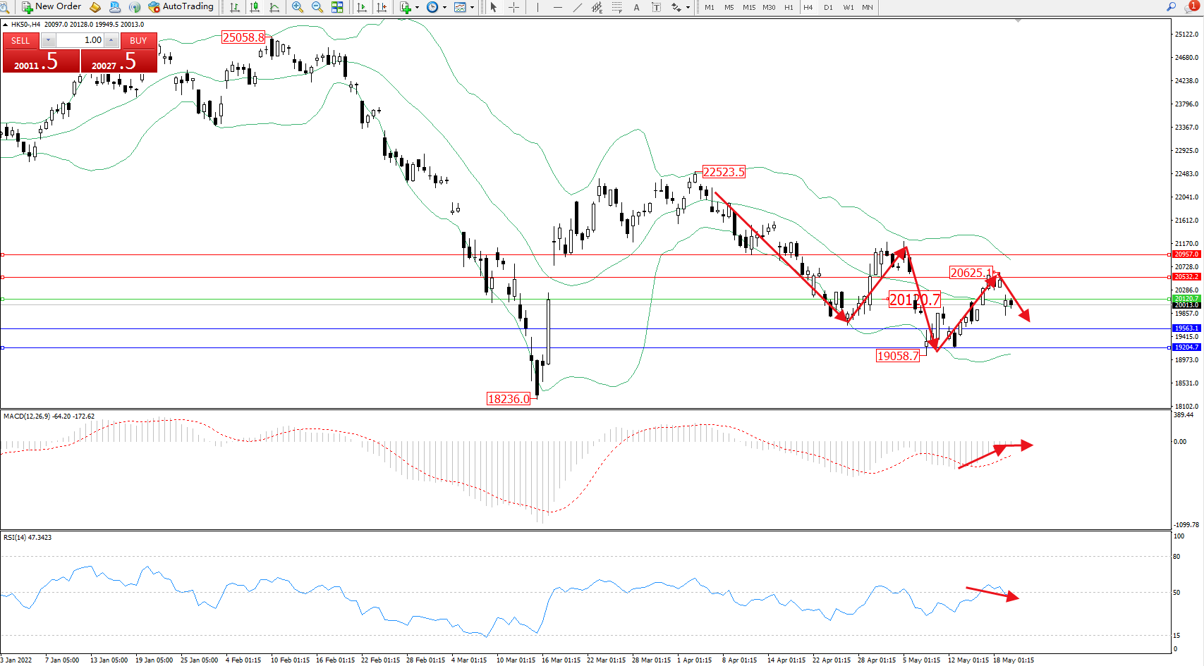 香港恒生指数5月19日(周四)收盘下跌523.6点,跌幅2.54%,报20120.68点;美国华尔街股市周三大跌,受隔夜美股大跌影响,恐慌指数飙升。港股全天维持跌势,恒生科技指数跌3.98%。大型科技股依旧领衔大市下跌,Q1业绩不及预期,腾讯大跌6.5%,阿里巴巴跌超7%,小米跌5%,今日南下资金逆势净流入65.4亿港元,大市成交额1211亿港元。