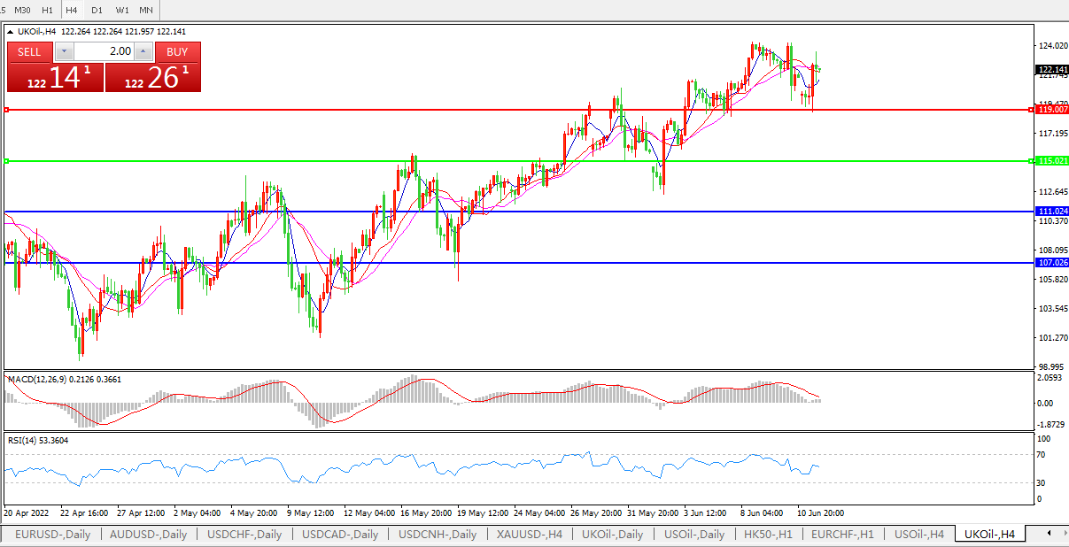 技术面简析:4小时图看,油价高位盘整,短线走弱后迅速拉升, MACD量能柱动能不足,RSI指标整理走强,日内继续走强概率较大。