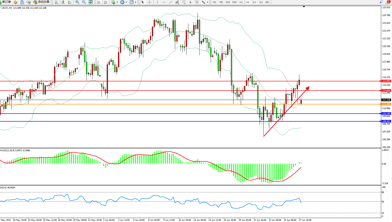 4小时图看:多头动力延续布林带指标通道中上轨区间持续拉升,短期多头有继续向上移动迹象,布林带指标呈张口走势持续中,MACD指标低位多头动力维持震荡上移至0轴线上方徘徊,RIS指标处于50均衡线上側整理;