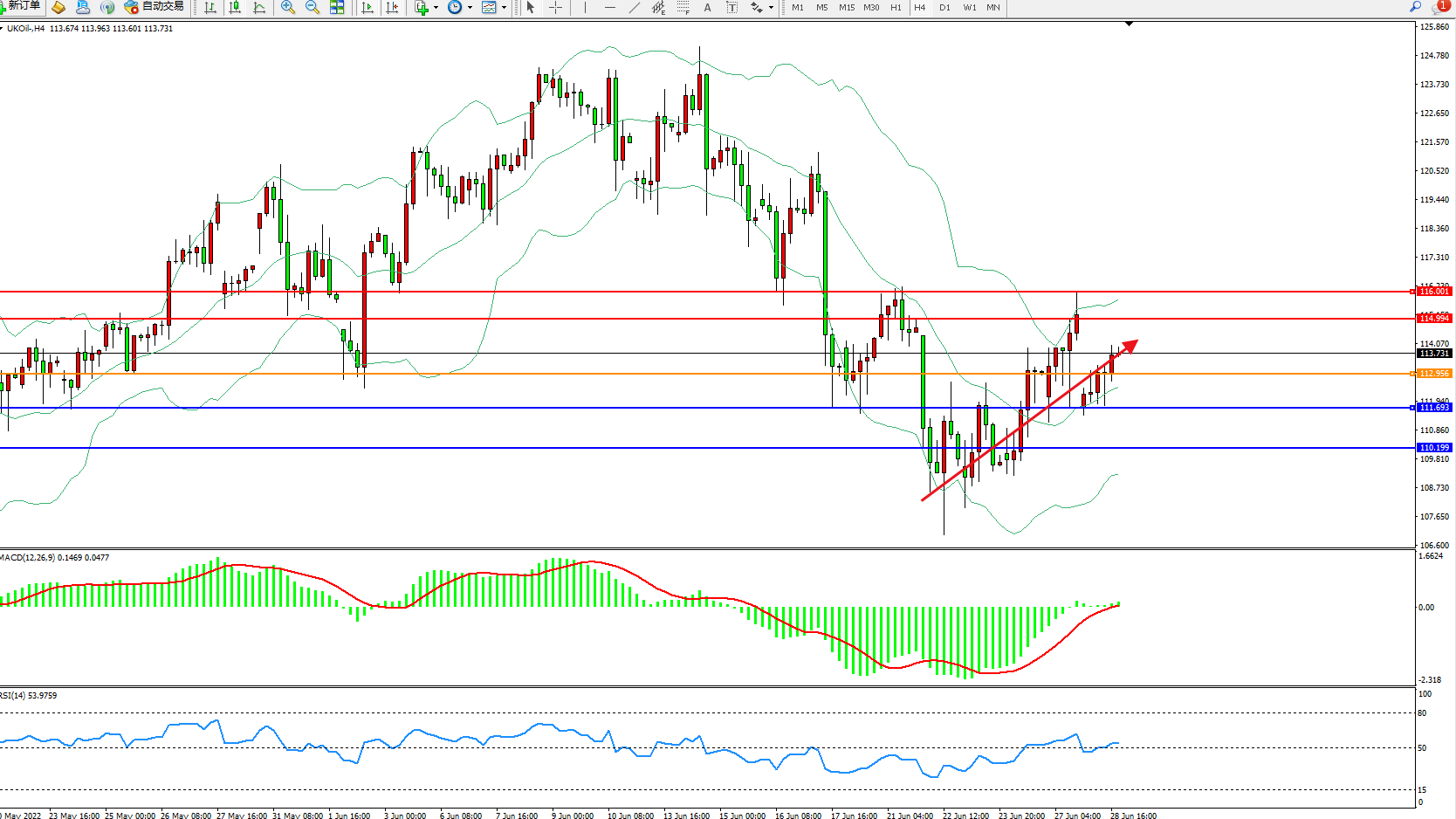 4小时图看:多头动力延续布林带指标通道中上轨区间持续震荡上移,短期多头拉升走势未见有止步迹象,布林带指标呈上行趋势走势态势良好,MACD指标处于0轴线附近弱势徘徊,RSI指标处于50均衡线上側窄幅整理;