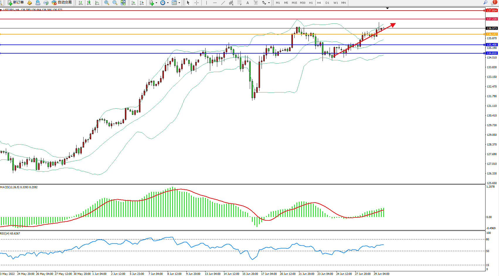 美元兑日圆维持136.573附近震荡,日本5月零售销售连续第三个月增长,强化了人们对强劲消费将引领本季度经济反弹的看法,尽管通胀上升给2022年剩余时间的家庭支出带来风险。