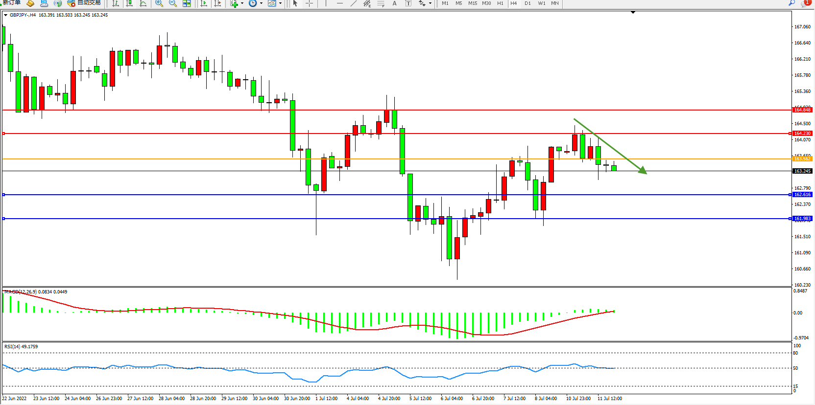 4小时图看:低位多头动力维持震荡上扬,高位短期遇阻整理,空头动力有伺机入场迹象,MACD指标处于0轴线上側徘徊,RSI指标处于50均衡线附近窄幅整理;