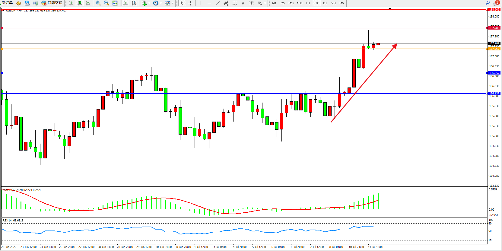 美元兑日圆维持137.407附近震荡拉升,市场不担忧日本央行在汇率上会有过激的干预行动。而在美元一篇强势的情势下,日元暂时还是看不到扭转颓势的机会。