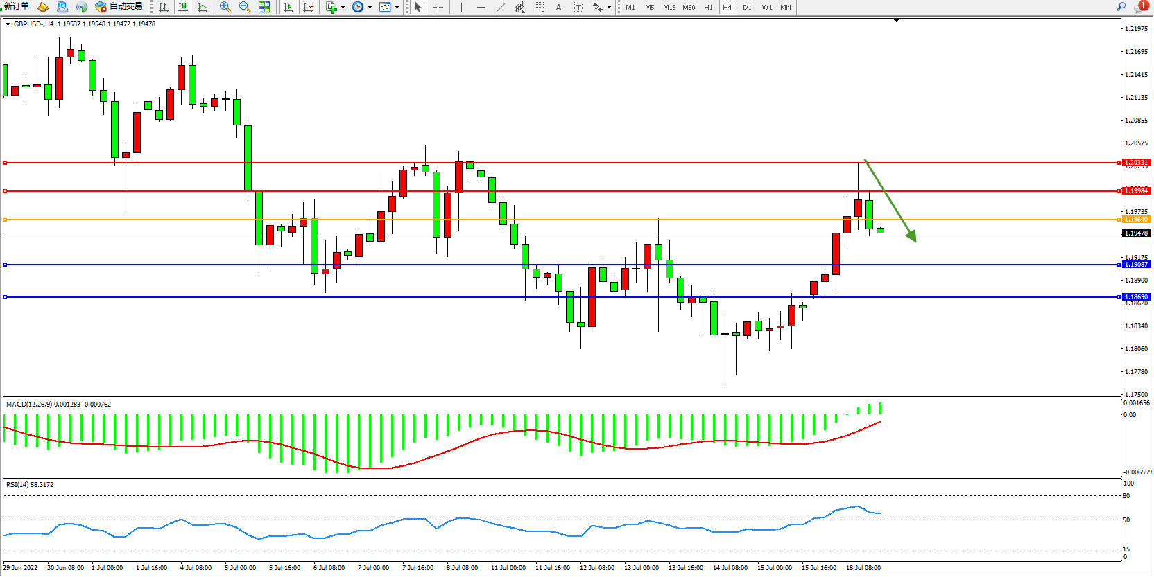 交易策略:1.19640下方看跌,目标1.19087、1.18690