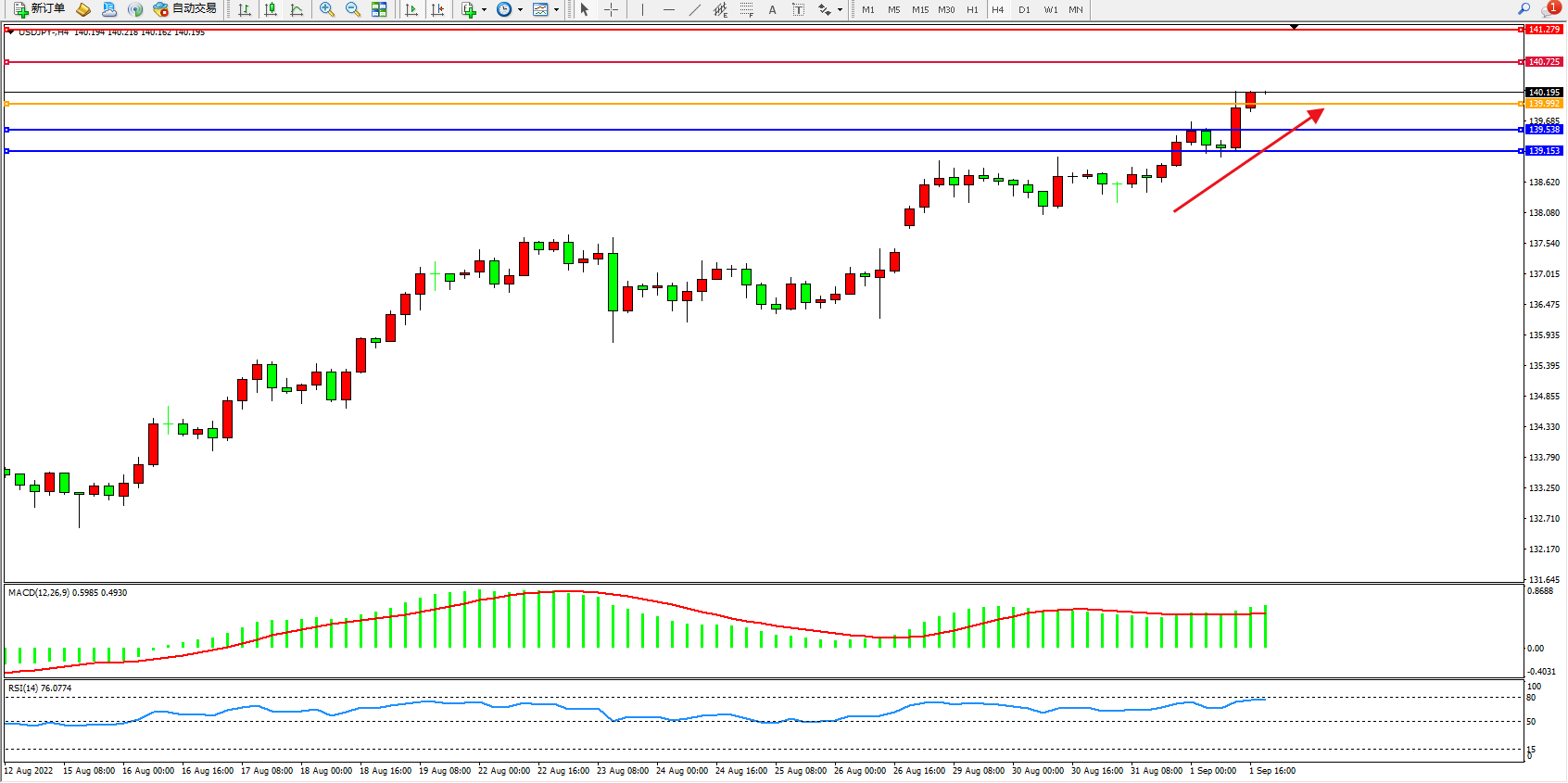 4小时图看:多头动力维持震荡拉升上扬,高位短期有继续向上移动态势,市场看涨情绪依旧,MACD指标处于多头区域维持整理,RSI指标处于多头区域高位整理上移;