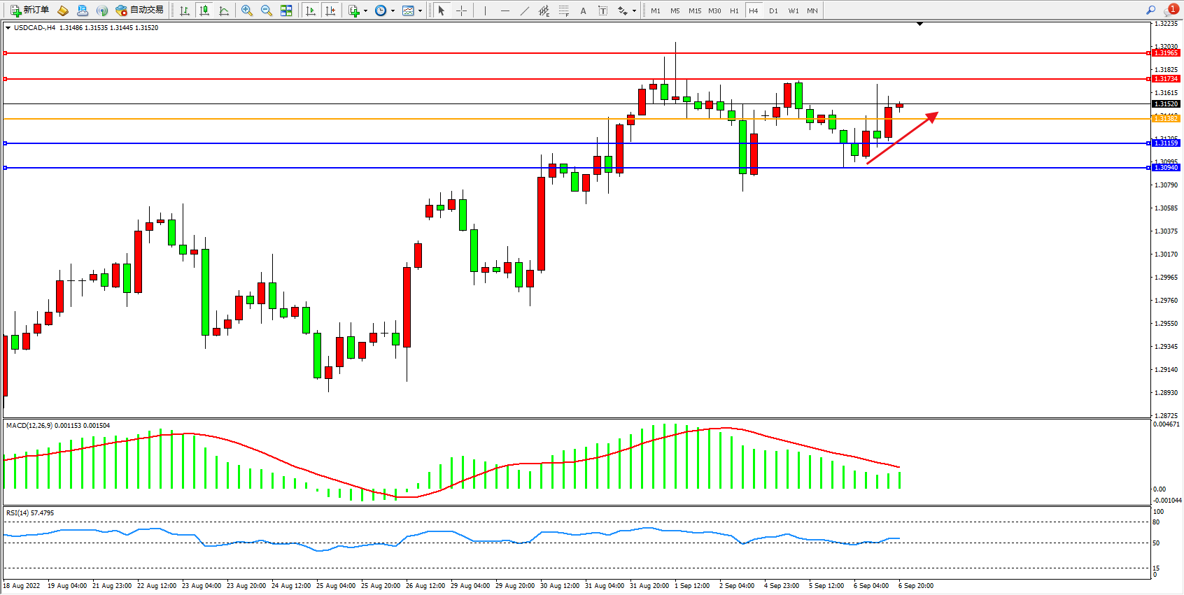 美元兑加元维持1.31520附近震荡,加拿大央行货币政策会议,预计将加息75个基点。加拿大央行将放慢9月份之后的加息步伐,只会在第四季度末将政策利率上调至3.75%。