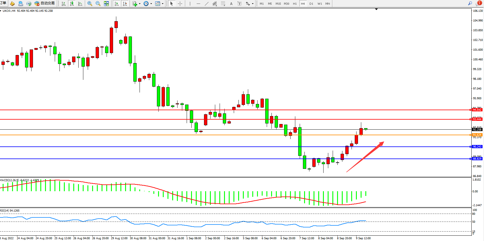 4小时图看:低位多头动力维持震荡上扬,短期看涨情绪开始入场,MACD指标处于空头区域维持整理上移,RSI指标处于50均衡线上側徘徊;