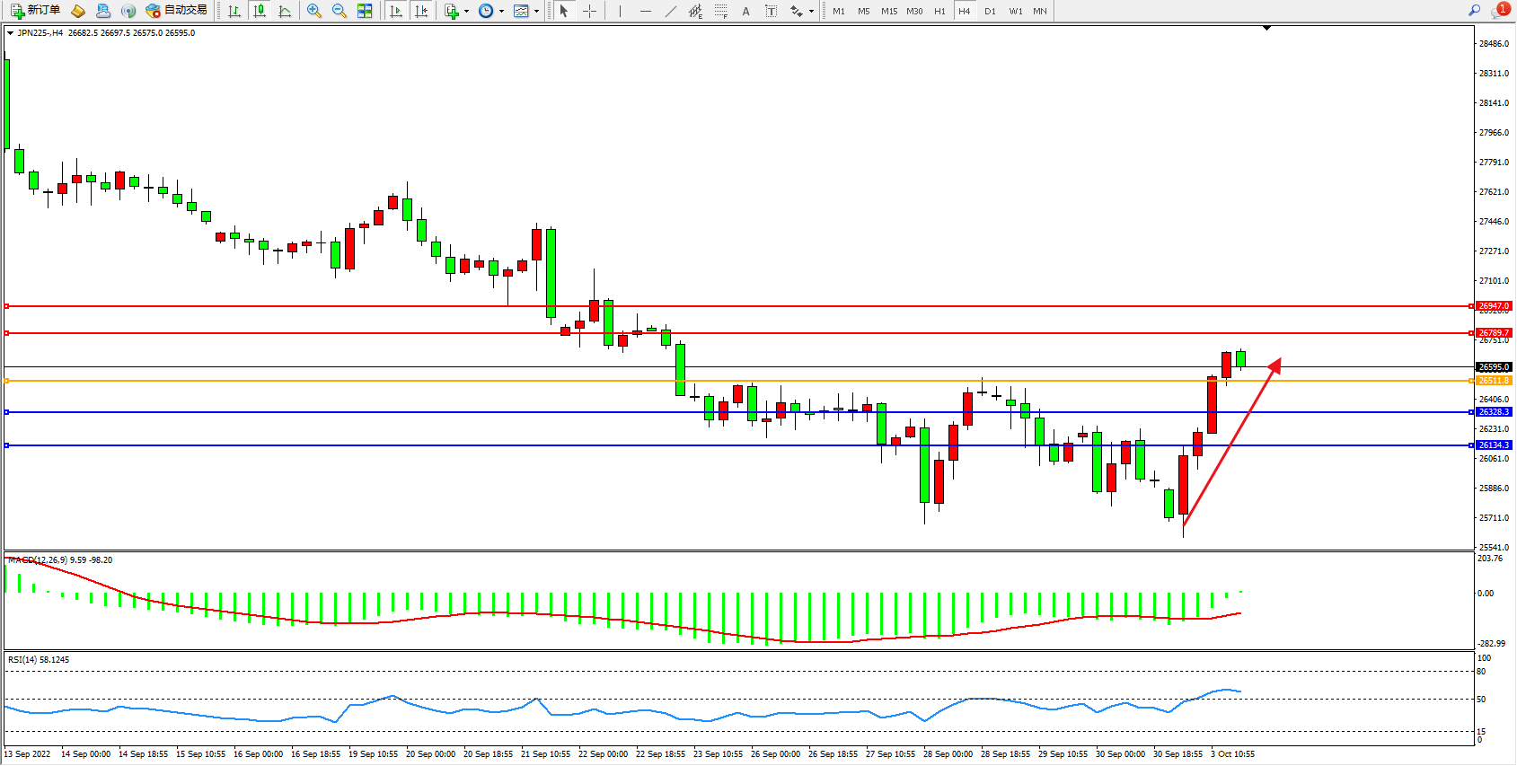 日经225指数10月3日(周一)收盘上涨241.79点,涨幅0.93%,报26179.00点。日本财务大臣铃木俊一:我们的立场没有改变,如果有必要,我们将在外汇问题上采取果断措施。将以强烈的紧迫感密切关注市场走势。