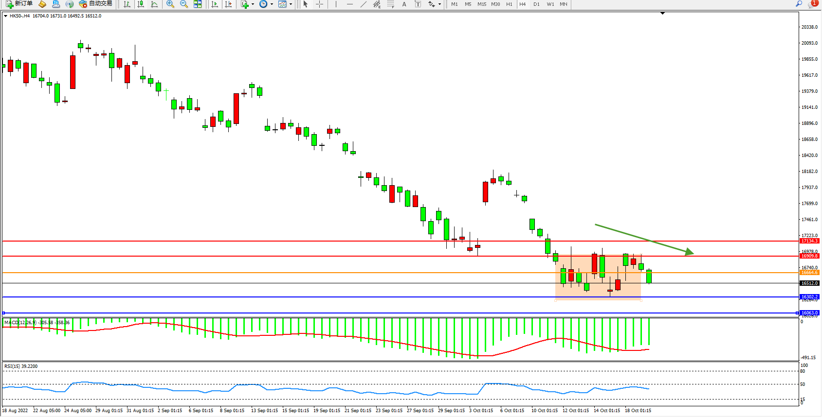 香港恒生指数10月19日(周三)收盘下跌403.3点,跌幅2.38%,报16511.28点;港股三大指数全天呈单边下跌行情,昨日反弹上涨的市场情绪再度陷入低迷。恒生科技指数跌4.19%,失守3200点关口。大型科技股全线下跌拖累大市下挫,阿里巴巴跌超5%,腾讯、百度等均下跌,香港特区行政长官李家超首承认本地劳动人口流失约14万人。放宽“非本地毕业生留港/回港就业安排”,将逗留期限由1年延长至2年,方便他们留港/来港工作。南下资金全天净买入港股45.4亿港元,此前已连续4日单日净买入额超50亿港元。