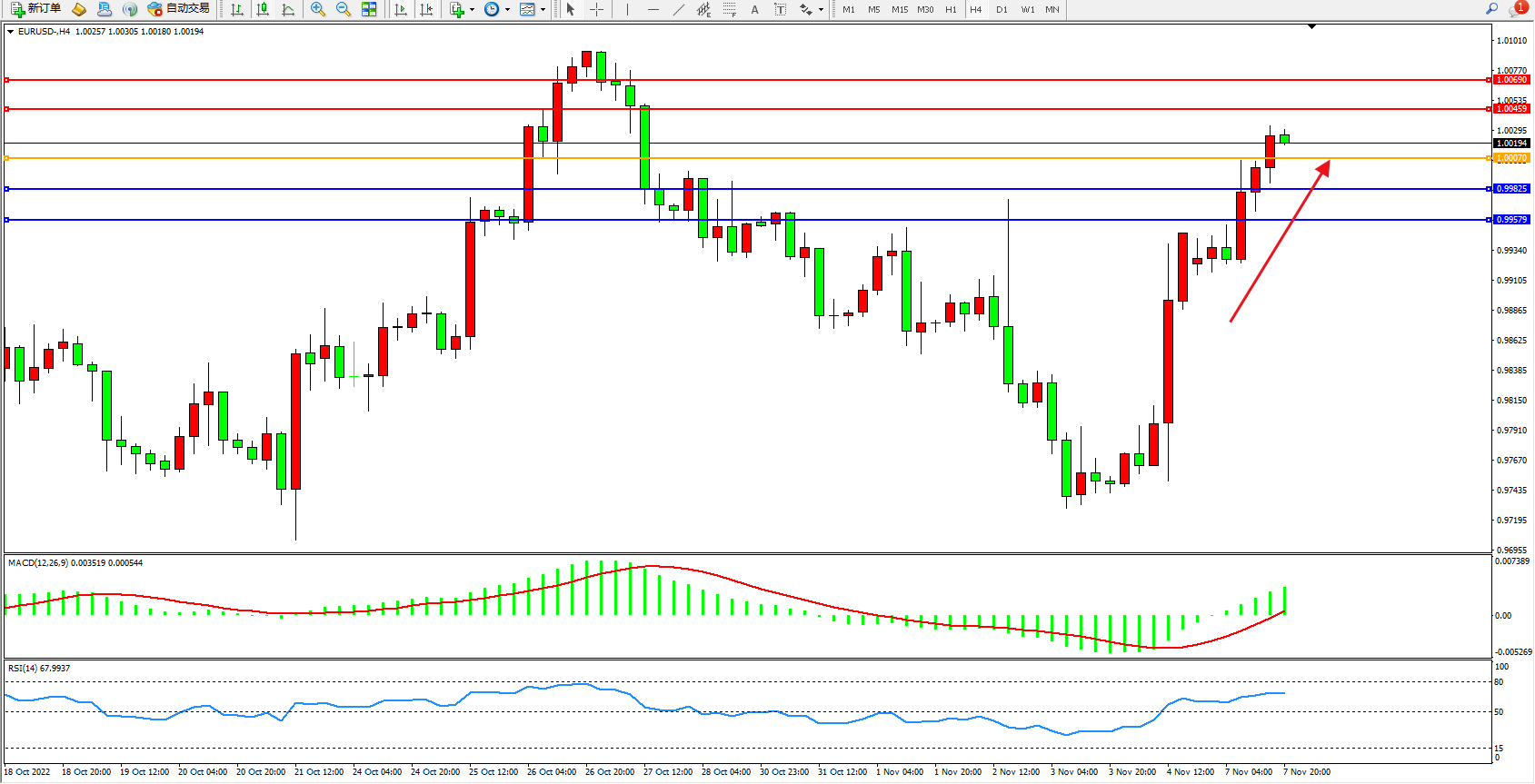 欧元美元EURUSD—4小时K线图显示:
